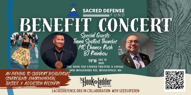 The Sacred Defense Fund (501c3) invites you to a powerful, Indigenous-led Benefit Concert for Mother Earth on December 11, 2025, at 9:00 PM at The Hook and Ladderin Minneapolis, MN. Experience an electrifying performance by local indigenous artists, singing and prayer by BJ Rainbow, and MC Chance Rush guiding the night as master of ceremonies and weaving together music, storytelling, and calls to action.